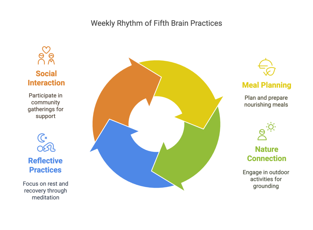 The final week focuses on integrating Fifth Brain practices into a sustainable lifestyle that continues beyond the 30-day program. This includes developing intuitive eating, integrating movement, optimising sleep, deepening spiritual connection, fostering environmental stewardship, sharing knowledge, planning long-term, and celebrating with gratitude.