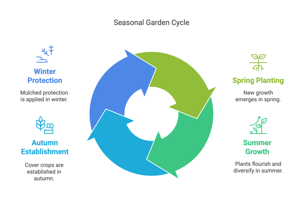 • Living roots maintenance: Keep overwintering cover crops thriving where possible.